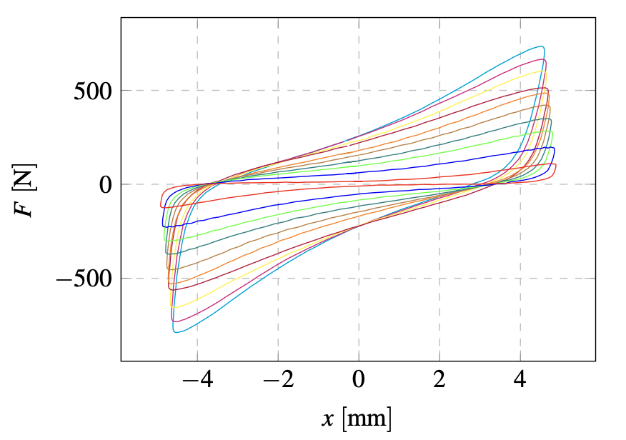 7. A Bouc-Wen model of the proposed design has almost constant parameters corresponding with the hysteresis loop. That makes the identification process much easier comparing to procedures presented in the referred papers. The authors checked the response of the model for the selected values of nonlinear parameters and observed that the convergence of simulations and empirical results is satisfactory.