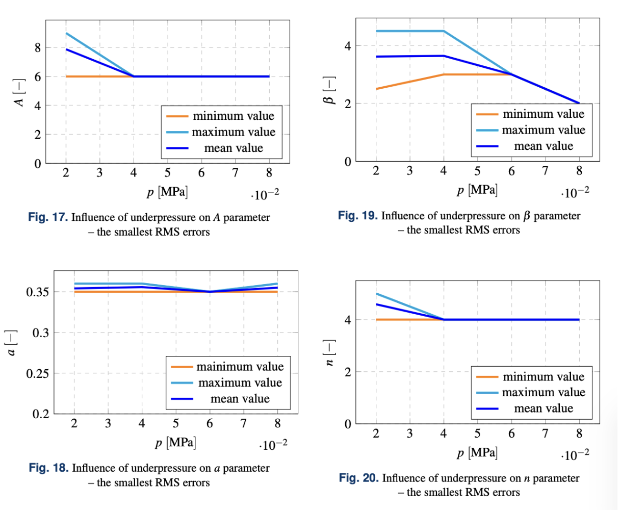 In Figs. 17–20 the variations of the identified Bouc-Wen model parameters in the partial vacuum function are depicted. It should be stated that at the recent stage of the VPP damper research it is hard to define universal trends related to the model coefficients characteristics. Although basing on data presented in Figs. 17 and 20, A and n parameters values seem to stabilize for higher values of underpressure while similar dependencies