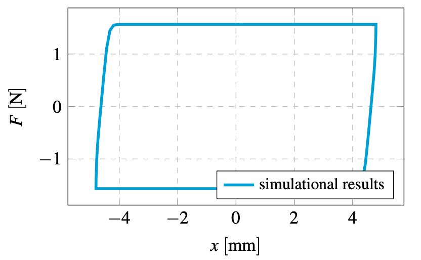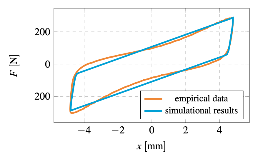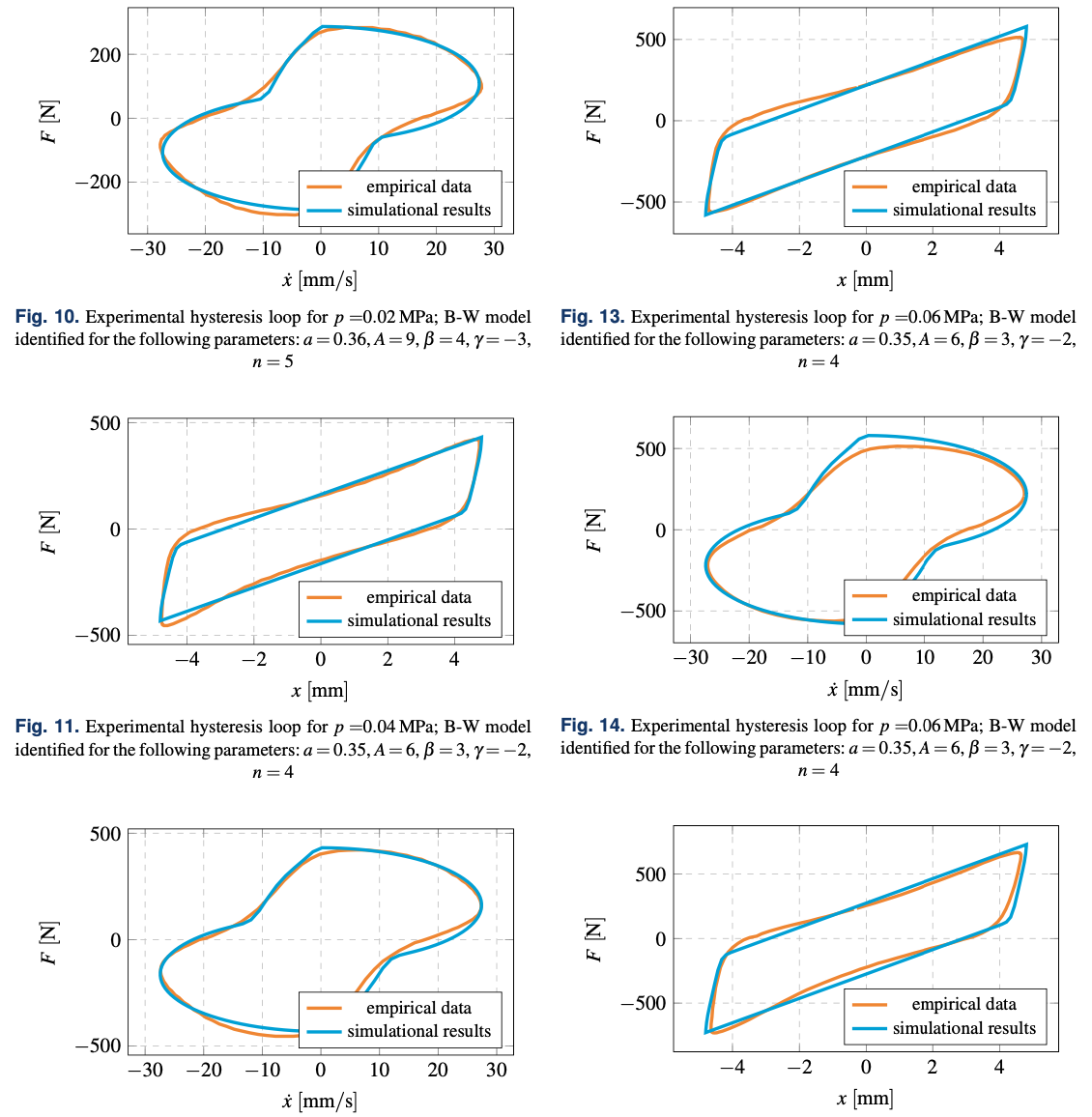 The conducted simulations outcome depicted in Figs. 9 and 10 show that for the assumed parameters of Bouc-Wen model, the obtained results are close to the empirical data. Some dis- crepancies are connected with the additional non-linear or dy- namic effects, which cannot be taken into account in the pro- posed approach. Still, the computed values model the proto- type in an acceptable way. The total RMS error was smaller than 0.01.