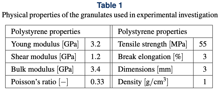 In experimental studies the authors used the polystyrene gran- ules shown in Fig. 4. Polystyrene is a granulate characterised with various visco-elastic properties which reflects in a much higher Young modulus, compressive strength and coefficient of friction comparing to other types of materials. In addition, one might observe that the granules have uniform dimensions and shapes, which results in a significant influence of the clusters occurring inside the sealed housing of the VPP damper.